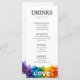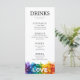 Este elegante cartão de menu de bebida vertical faz parte da coleção de Casamentos Pintados com amor LGBTQ+. Ele apresenta um design impressionante com pinceladas infusoras no arco-íris na parte inferior, criando uma base viva para a palavra ousada e branca "AMOR". A frente do cartão é um menu de bebidas dedicado. Está organizado em seções para Cocktails, Espíritos, Vinhos e Cervejas, com uma variedade de opções de bebidas enumeradas em cada título. O texto é limpo e fácil de ler, garantindo que seus convidados possam encontrar rapidamente a bebida preferida. A parte de trás do cartão apresenta uma mensagem sincera e personalizada para os seus convidados. O texto, intitulado "Querido Convidado", é um caloroso convite para que se possam inscrever nas bebidas artesanais e se juntem a esta celebração. A mensagem termina com um carinhoso sinal do casal feliz. Este cartão de face dupla não é apenas um guia prático para os seus convidados, mas também um belo e sentimental guardião do seu dia especial.