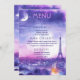 From the Amour Éternel à la Parisienne collection, this double-sided flat menu card brings refined romance to your reception tables. Measuring 5" x 7", the front showcases your menu selections in elegant serif and script fonts, framed by a dreamy watercolor illustration of the Eiffel Tower under a moonlit lavender sky. Parisian rooftops glow softly beneath hues of blush, violet, and twilight blue, setting the tone for a magical evening.