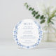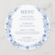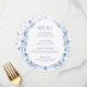 Incêndio em uma elegância vibrante com nosso cartão de cardápio de primavera/verão. Apresentando uma coroa de flores azuis e delicado texto azul.
