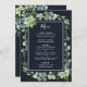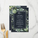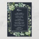 Este menu de casamento apresenta cores d'água suculentas, eucalipto e folhas verdes botânicas com uma estrutura retangular sobre fundo azul de marinho da meia-noite. Itens correspondentes também estão disponíveis.