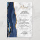 A borda esquerda deste elegante cardápio moderno de casamento apresenta uma marinho azul de aquarela agata bordada com falso brilho dourado. O texto personalizável combina um script de escrita manual dourado e uma fonte de impressão preta em cinza e fundo de mármore branco. O verso apresenta um design azul-marinho e um agate-ouro correspondentes.