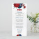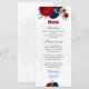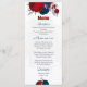Vermelho escuro romântico e flores azuis marinhos com cartão de cardápio botânico de folhas prateadas. Os detalhes de brilho são simulados.