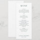 Este menu de casamento elegante apresenta um design limpo e minimalista com um layout vertical centrado na palavra "MENU" em fonte serifada maiúscula grande. A paleta de cores é simples e sofisticada, usando texto preto em fundo branco para máxima legibilidade. Cada seção — Entradas, Salada, Prato Principal e Sobremesa — é claramente definida com espaçamento e tipografia consistentes que combinam fontes serifadas clássicas com estilos sans-serif mais simples, criando uma hierarquia visual sutil. Perfeito para eventos formais como casamentos, este design se concentra apenas no conteúdo textual para transmitir clareza e elegância sem quaisquer elementos decorativos adicionais.