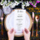 Projetado para complementar qualquer tema de casamento ou decoração, este cartão de menu apresenta um layout limpo e minimalista adornado com a tipografia clássica para um toque de refinamento.