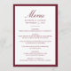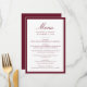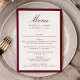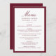 This wedding menu showcases “Menu” in rich burgundy calligraphy, with coordinating serif text for the couple’s names, wedding date, and menu selections. The burgundy border adds warmth and a sense of classic romance, creating an elegant presentation well-suited for formal and evening receptions. The combination of the deep burgundy color and traditional typography gives the design a refined, finished feel.