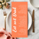 The modern coral orange wedding menu cards feature a bold coral orange color paired with a clean and modern layout. The design is simple, stylish, and easy to read, making it perfect for contemporary wedding tables.