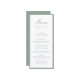 This wedding menu is styled with soft sage green calligraphy for the “Menu” heading, complemented by refined serif text for the names, date, and dining selections. The muted green border creates a calm, organic contrast against the white background, making it especially well-suited for botanical, garden, and romantic wedding themes. The airy color palette and structured layout provide a graceful way to present your reception menu while keeping the overall look light and elegant.