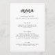 Menu de casamento simples e elegante em um estilo de design minimalista moderno com uma tipografia de escrita natural elegante em preto e branco clássico, com uma fonte de estilo de escrita à mão informal. O texto pode ser facilmente personalizado para um design único para o seu dia especial. Se precisar de ajuda para personalizar este produto, por favor entre em contato usando o botão de mensagem abaixo e ficarei feliz em ajudar.