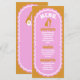 Nosso cartão de cardápio de casamento com estilo retrógrado mínimo e ousado é perfeito para o casal da moda que ama se destacar e fazer uma declaração ousada. Nosso design apresenta uma combinação de cor rosa brilhante e amarela. Um simples arco de onda abstrato e formas de círculo criam uma aparência em negrito com o "menu" exibido ousadamente em letras grandes brancas. O verso apresenta um monograma em negrito