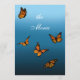 Uma variedade de borboletas de monarca preto, laranja e branco num pano de fundo de ombre azul.