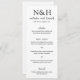Menu de casamento moderno, com um design preto e branco simples e mínimo com seu monograma em uma fonte em negrito junto com seus nomes em um roteiro elegante.