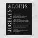 Menu de casamento do orçamento moderno (impresso no papel do folheto fino) com um design preto minimalista com seus nomes em uma fonte grande ao longo do lado esquerdo e superior. Esta design é simples o suficiente para um casamento formal, mas faz uma declaração ousada.