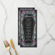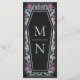Adicione um toque de elegância gótica ao seu banquete com estes menus de casamento com uma armação em forma de caixão, adornada com espinhos, rosas e sotaques prateados contra um fundo preto. Perfeito para uma experiência amorosa de jantar romântica! Personalize o texto, a fonte e a cor de fundo para se adequar às suas preferências de design. Correspondência de Itens em nosso compro para um tema completo de festa. Observe que a prata nos cartões NÃO é uma folha real e é impressa em cores planas.