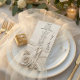 Elevate your reception tablescape with this elegant monochromatic design featuring a romantic couple amidst rolling hills, rendered in warm ivory tones.This design showcases a highly detailed, monochromatic illustration that mimics the look of a classical bas-relief sculpture. A bride and groom are depicted holding hands on a cobblestone path, framed by large blooming roses in the foreground and rolling hills in the distance. The color palette utilizes sophisticated shades of cream, beige, and off-white to create a warm, neutral aesthetic. Typography is arranged in a formal hierarchy, pairing classic serif fonts for the main courses with a vertical, handwritten script for accent text.