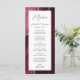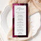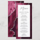 Este menu de casamento elegante e moderno apresenta um fundo de ágata burgundy em aquarela, aparado com brilho prateado falso. O texto aparece em caligrafia elegante em cinza carvão e fontes sem serifa em um retângulo branco. O desenho de ágata é repetido no verso.