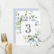 Este design apresenta flores azuis empoeiradas e folhas de eucalipto em tons de verde.
