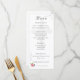 Design apresenta a imagem esmaecida de um crucifixo de cor prateada contra branco puro como fundo para o seu texto personalizável. O formato segue o de um cardápio de casamento tradicional. A imagem de uma rosa rosa levanta o canto inferior esquerdo. Os nomes da noiva e do noivo, juntamente com a data do casamento, são mostrados ao contrário no final. Projetado para coordenar com a "Suíte Nupcial de Casamento Católico Rosa." Todo o texto está em uma fonte prateada.
