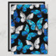 Borboletas realistas, azuis e brancas têm um padrão uniforme em fundo preto.