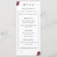 Design apresenta um título elegante em uma fonte Nupcial de cor prateada. Os cantos superior esquerdo e inferior direito são seguidos pela imagem de rosas finos. Um florescimento de cor prateada borda os lados. O canto inferior esquerdo apresenta o símbolo tradicional de cruz e anéis para o casamento. O design inverso apresenta as iniciais da noiva e do noivo na fonte Nupcial.