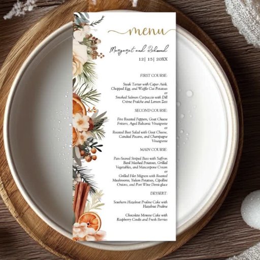 Adicione um toque de elegância ao seu banquete de casamento com o nosso 'Menu de Casamento de Natal Floral da Citrus Winter Citrus!' Completando perfeitamente nossa coleção, esse menu promete impressionar seus convidados. Compre agora e defina o palco para uma experiência memorável de jantar!