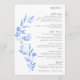 Elementos: uma videira elegante no estilo da pintura de porcelana vintage. Os nomes aparecem em um script moderno; outros detalhes em fontes clássicas de serifa Cores: azul, azul de porcelana, azul delft, azul francês, cinza. Temas: elegante, moderno, minimalista, jardim, sutil, leve, areia, eterno, safra. Coleção: Mínimo Elegante Porcelain Floral Chinoiserie Coleção de Casamentos Tipo: Menu