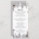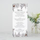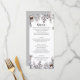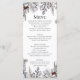 Os detalhes do menu são dentro a moldura de botânicos com aquarela incluindo eucalipto, pinheiro e folhas em prata, ferrugem e cinza. A parte traseira da placa é uma cinza pálida