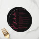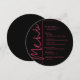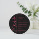 Um cartão de menu de jantar preto redondo apresenta suas opções de menu em letras magenta chiques, perfeito para um moderno casamento, jantar de ensaio de casamento, festa de aniversário ou qualquer evento especial com jantar sentado. Personalize facilmente com o seu menu e detalhes. MAIS cores em nossa loja.