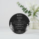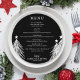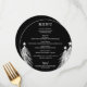Um cardápio de jantar redondo preto elegante com árvores de Natal brancas apresenta os detalhes do seu cardápio em letras sofisticadas. Perfeito para uma festa de Natal de férias ou qualquer evento especial com jantar sentado.