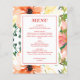 Cartão de Menu Floral de Casamento Floral Laranja Primavera de Orçamento (tamanho 4,5"x 5,6") O cartão de menu de casamento Elegante tem um fundo floral intenso de primavera. As flores de aquarela são laranja, rosa e roxa. A seção de texto neste menu é simples devido a fundo floral vívido. "Orçamento" significa, no título, o preço de barato para os clientes. Este cartão de cardápio de casamento é parte da "Coleção Floral A101 de Laranja Primavera" onde você pode encontrar uma variedade de produtos coordenadores de casamento. Há duas maneiras de encontrá-los: 1) Visite a coleção inteira em: https://www.zazzle.com/collections/spring_orange_floral_collection_a101-119588692587736567 ou 2) Escreva A101 na caixa de pesquisa DESTE compro Para mais informações, contacte-nos szdesigns2021@gmail.com