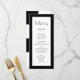 Este simples design tem seus detalhes de menu em uma fonte moderna rodeada por um quadro preto elegante. Um design clássico para o seu casamento de gravata negra. Você pode personalizá-lo clicando no link personalizar. Isto é parte de uma suite de casamento clássica que inclui guardanapos, cartões de lugar, cartões de número de tabela e muito mais essencial.
