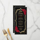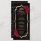 Cartão de menu vermelho de ouro preto Quinceanera. Apresenta fontes de script, rosa vermelha, tiara e confetti. Design clássico com ouro falso brilhante. Perfeito para uma elegante celebração de glam.