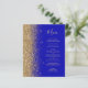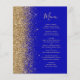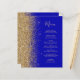 A borda esquerda deste elegante menu de casamento moderno apresenta uma borda falsa dourada. O texto personalizável combina um script de escrita manual branco de cor dourada e fontes em um fundo azul real. O verso apresenta um design de brilho azul real correspondente e ouro.
