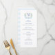 Este elegante design de menu azul e branco apresenta as minhas próprias ilustrações de aquarela (a crista e o banner de aquarela). Mostrada aqui para um Casamento, mas com algumas pequenas mudanças, esta design funcionaria lindamente para um batizado/batismo ou menu de festa de aniversário adulta.