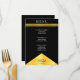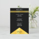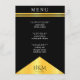 Placa de menu recepção de casamento preta com triângulo geométrico e faixas de bloco dourado. Tipografia elegante para um olhar caro sobre o preço do barato. Personalize a lista de refeições e os detalhes pessoais. Excelente para um moderno tema minimalista do casamento com um toque de estilo.