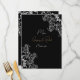 Placa de menu de Recepção de casamento Dourada e preta projetada com texto branco e dourado sobre fundo preto com sotaques brancos. O texto inclui: os primeiros nomes e a data de casamento da noiva e do noivo. O verso inclui: Seleções do Apetista, Entre Seleções e Seleções do Deserto. Para personalizar, basta inserir as seleções de menu na nossa modelo fácil, substituindo o texto de exemplo. Certifique-se de ver toda a Coleção de Casamentos Dourados e Pretos para cartões e acessórios correspondentes.