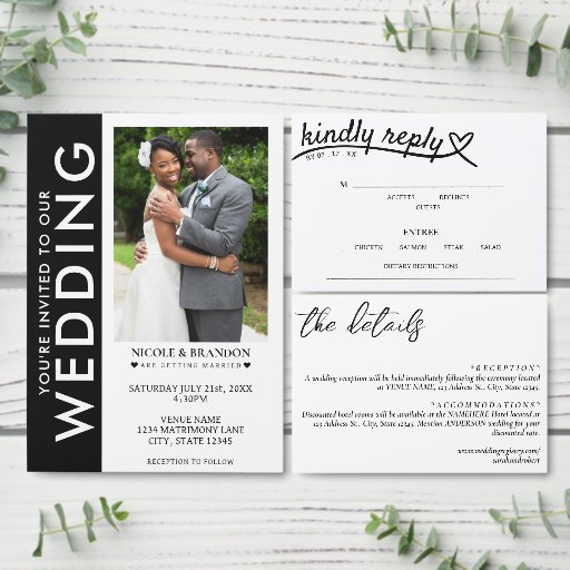 Placa de menu preta e branca com arco geométrico de blocos coloridos. Tipografia elegante para um olhar caro sobre o preço do barato. Personalize a lista de refeições e os detalhes pessoais. Excelente para um moderno tema minimalista do casamento com um toque de estilo.