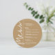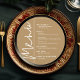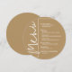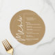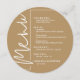 Um cartão de menu de jantar redondo dourado apresenta suas escolhas de menu em letras brancas chiques, perfeito para um casamento moderno, jantar de ensaio de casamento, festa de aniversário ou qualquer evento especial com jantar sentado. Personalize facilmente com suas escolhas de jantar e detalhes. MAIS cores em nossa loja.