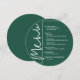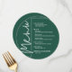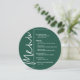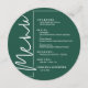 Um cartão de menu de jantar redondo esmeralda verde apresenta suas opções de menu em letras brancas chiques, perfeito para um moderno casamento, jantar de ensaio de casamento, festa de aniversário ou qualquer evento especial com jantar sentado. Personalize facilmente com suas opções de jantar e detalhes. MAIS cores em nossa loja.