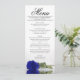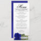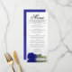 Este belo menu irá adicionar algum estilo à sua recepção de casamento. Apresenta um belo e romântico design com um solteiro vivo azul real ou rosa de cobalto estacionado do seu lado, refletindo numa piscina de água com ondas e ondulações. Há espaço para os nomes do casal e da data do casamento, e o texto é totalmente personalizável.