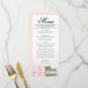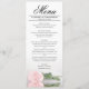 Este belo menu irá adicionar algum estilo à sua recepção de casamento. Apresenta um belo e romântico design com um solteiro cor-de-rosa, pálido e pálido, ao lado, refletindo numa piscina de água com ondas e ondulações. Há espaço para os nomes do casal e da data do casamento, e o texto é totalmente personalizável.