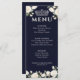 Menu elegante para quinceanera ou outra ocasião com princesa tiara e rosas brancas. O design tem uma paleta colorida de marinho escuro, azul-escuro, prata e branco cremoso. A coordenação de papelaria e decoração de festas está disponível na minha Coleção Princesa de Vestidos e Rosas Quinceanera, mas por favor, envie-me uma mensagem se precisar que eu acrescente outros itens.