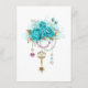 Chave de ouro antiga com rosas de turquesa de tendência, decoradas com folhas de ouro branco e miçangas cor-de-rosa e azuis. Cor agradável. Rosas de turquesa. Ouro branco. Tifania azul.