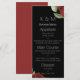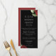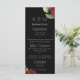 Este menu elegante e romântico apresenta um design floral. Rosas vermelhas e folhagens acentuam os cantos superior direito e inferior esquerdo. O fundo é um preto sombrio com fonte branca. Você pode substituir os itens do menu com as opções de comida de sua escolha. É adequado para um evento de café da manhã, brunch, almoço ou jantar, ou para um casamento ou banquete.