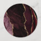 The left-hand edge of this elegant round modern wedding menu features a burgundy red watercolor agate border trimmed with faux gold glitter. The customizable text combines gold-colored handwriting script and copperplate fonts on a burgundy agate background. The reverse side features a matching burgundy and gold agate design.