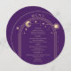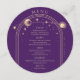 Mística Roxo Dourada Sol Lua Espacial Cartões Cartões de Menu de Casamento Ouro, Lua e Estrelas se enquadram em um fundo roxo com detalhes de menu no centro em um moderno roteiro de caligrafia dourada. Personalize editando o texto nas caixas de texto fornecidas. Projetado para você pelo Evco Studio © em www.zazzle.com/store/evcostudio