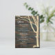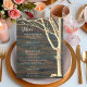 Menu Rustic Dark Wood Winter Tree Wedding. O design tem textura escura de madeira, uma árvore no inverno e flocos de neve. O texto está em uma escrita branca e moderna. Você pode personalizar facilmente todo o texto - personalizá-lo com a noiva e o nome do noivo, a data do casamento e o menu do seu casamento. Este menu de casamento vai com outros itens da coleção - você pode encontrar o link abaixo deste menu.