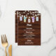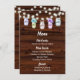 Um cardápio de casamento com textura rústica, com jarras de hipnagas florais e uma corda de luzes. Este menu faz parte de um convite para casamento.