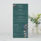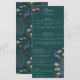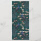 Este cardápio de casamento rústico e moderno apresenta ilustrações desenhadas à mão do estilo "Chinoiserie" de uma ave pavão azul e lacrimogênea cercada por Magnolia greenery, mostrando creme vibrante e flores cor-de-magnólia cor-de-rosa pinceladas, todas contra um elegante fundo verde-negro. O verso apresenta um elegante padrão floral e de pássaros com ilustrações coordenadas. Todo texto é editável. Personalize com seus detalhes de casamento, incluindo nomes de noiva e noivo, aperitivo, curso principal, mesa de sobremesa e bebidas.