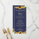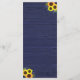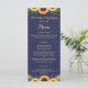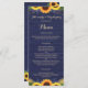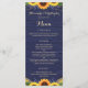 Este design rustico apresenta luzes de cordas de ouro e rendas junto com girassóis e lavandas contra um fundo de madeira azul marinho. O texto, com nomes personalizáveis de noiva e noivos e detalhes de eventos, aparece em ouro pálido na escrita popular e na tipografia serif. Você pode personalizar este menu para seu próprio casamento mudando o texto na modelo.