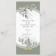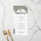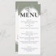 Um belo cardápio de casamento moderno em verde sábio e branco com folhas de eucalipto (frente e verso). Fácil de atualizar - um lado mantém suas opções de comida, o outro contém uma mensagem pessoal e seus nomes. Absolutamente adorável design com anéis de casamento mostrando na design com seus nomes.